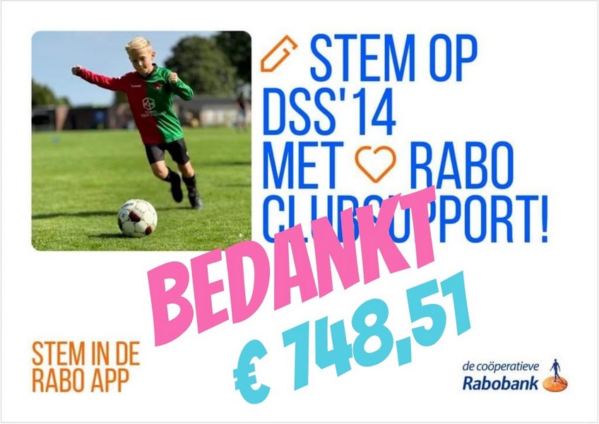 De afgelopen periode kon er op DSS'14 gestemd worden tijdens de Rabo Clubsupport. Dit is door vele leden van de Rabobank gedaan en heeft DSS'14 een mooi bedrag opgeleverd van € 748,51. Wij danken alle mensen die een stem uitgebracht hebben op DSS'14 hartelijk voor hun steun.
